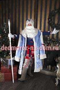 Синяя шуба Деда Мороза обрамлена широкими полосами короткого белого меха, из него же сделаны манжеты, воротник и край шапки. Сама шуба расшита серебристой тесьмой, из более тонкой тесьмы вышиты снежинки, которые придают особый колорит костюму. Под шубой у Деда Мороза надета длинная белая рубаха. Рукава рубахи украшены серебристыми манжетами и продеваются через прорези в шубе. Рубаха подпоясывается широким атласным синим поясом с серебристыми кисточками.