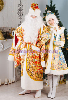 Снегурочка в этом костюме составляет пару Деду Морозу в костюме «Хохлома». Костюм Снегурочки также выполнен по индивидуальному заказу из эксклюзивной ткани. Ткань, как и у Деда Мороза, выполнена внутренней печатью и отлично смотрится. Эти костюмы есть только у нас, спешите сделать заказ с необычными Дедом Морозом и Снегурочкой! |