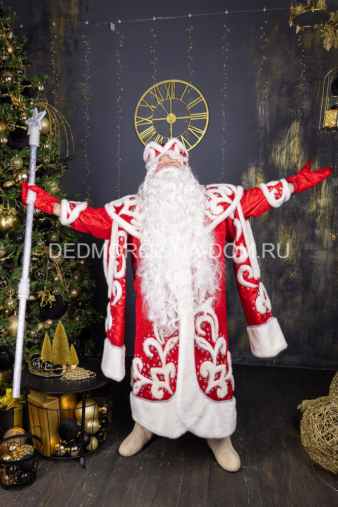 Этот костюм Деда Мороза сделан из красного бархата с красными узорами, что делает цвет интенсивнее, а саму шубу более красивой и интересной. Шуба также разрисована причудливыми серебристыми узорами и украшена большими растительными орнаментами со стразами того же цвета. Край шубу отделан коротким белым мехом. Из этого же меха сделаны манжеты, воротник и край шапки. Под шубой у Деда Мороза находится длинная белая рубаха с серебристыми манжетами, которая подпоясывается широким красным поясом. Внизу рубаха украшена широкой серебристой тесьмой.